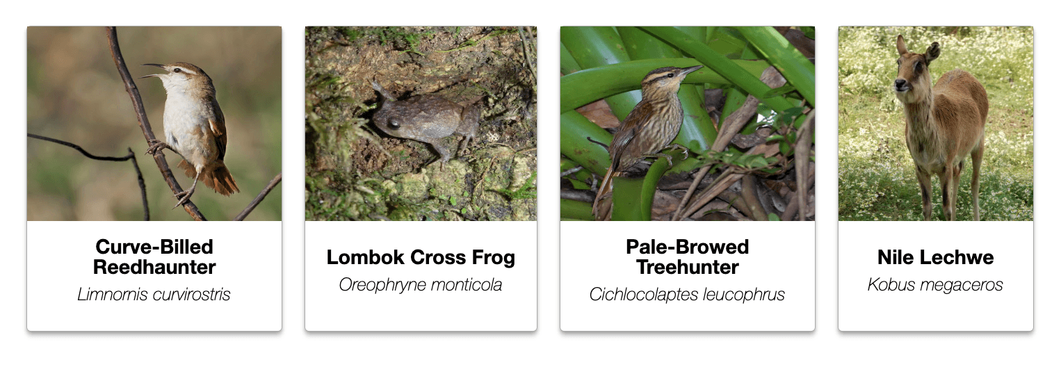 Visualize projected habitat loss driven by urban and non-urban land-use change for individual species under three different development scenarios by navigating to the “Projections” tab of most bird, mammal, amphibian, or reptile species pages, or start exploring from the highlighted species below:
