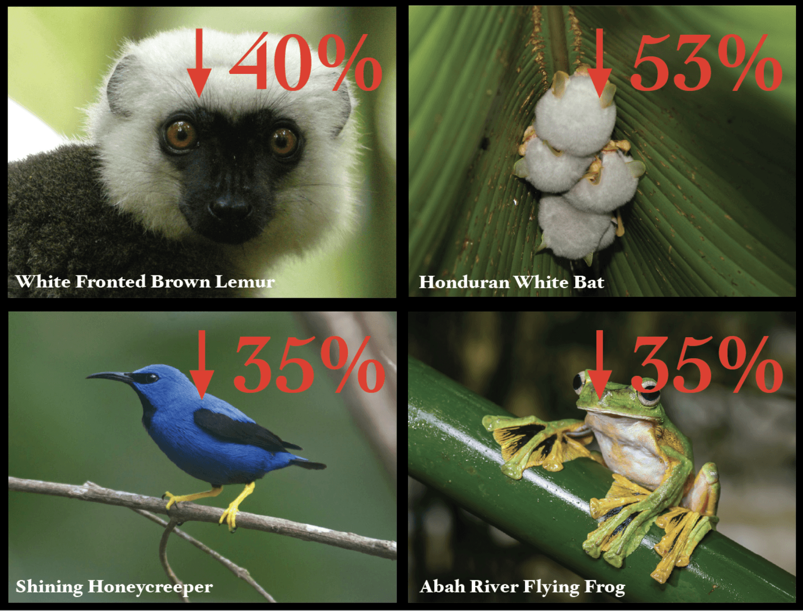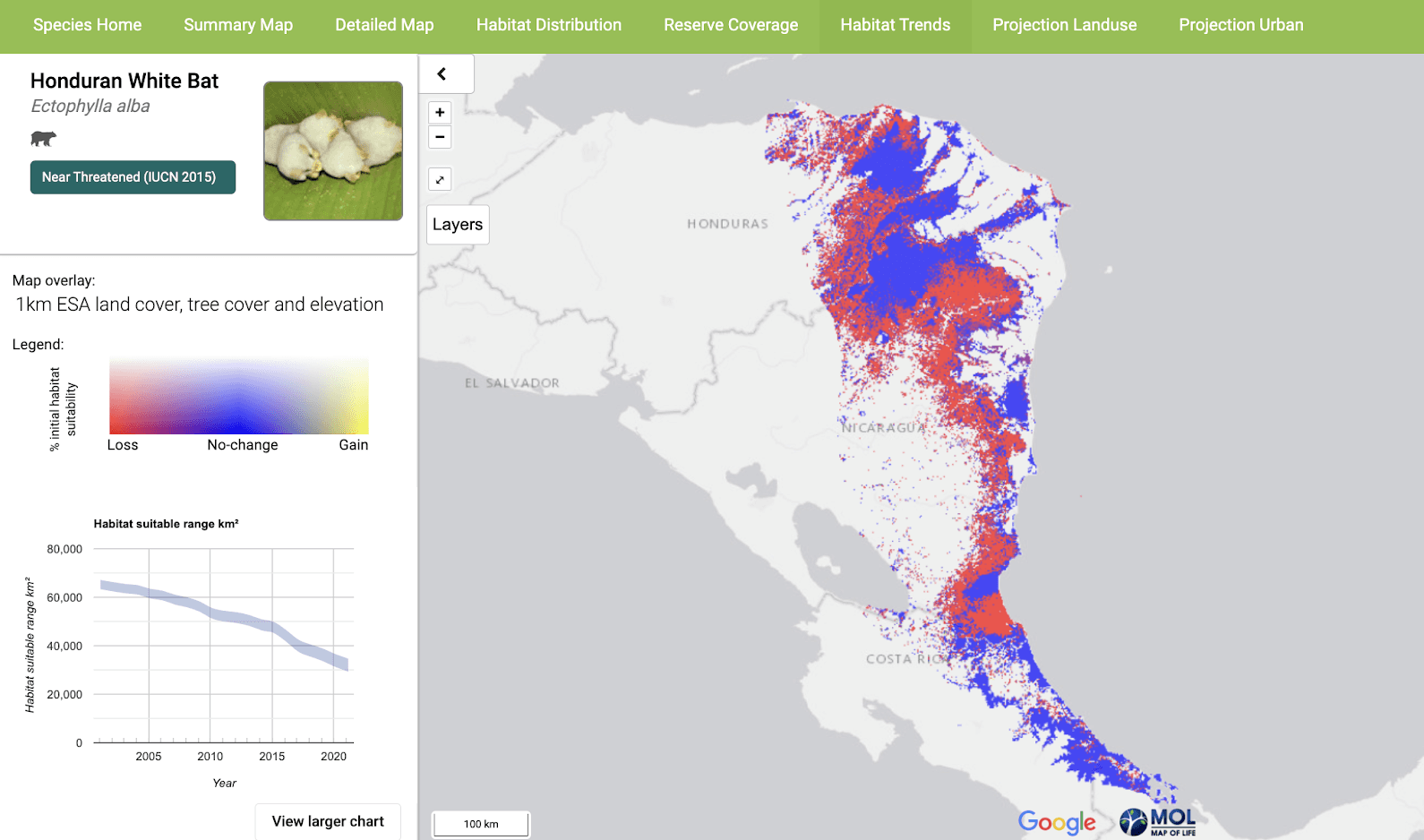 “Can we find a way to share the planet with the rest of its inhabitants?” rings the plea from the article, which shares the faces of those species facing the most severe habitat loss – species like the miniscule Honduran White Bat, which has suffered a 53% loss of suitable habitat area and a 46% decrease in habitat connectivity since 2001, and the Madagascar-endemic White-Fronted Brown Lemur, which has lost 40% and 36% of its habitat area and connectivity, respectively.